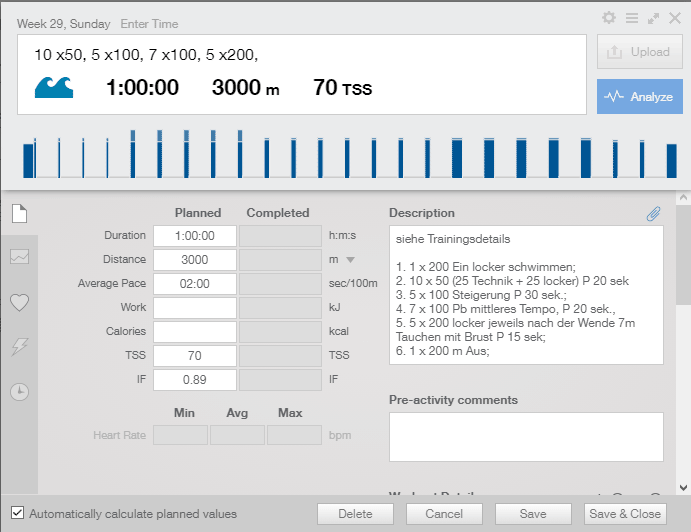 - Jede Einheit für Schwimmen, Radfahren und Laufen enthält detaillierte Trainingsvorgaben über die Intensität und Dauer der Intervalle bzw. der Trainingseinheit.