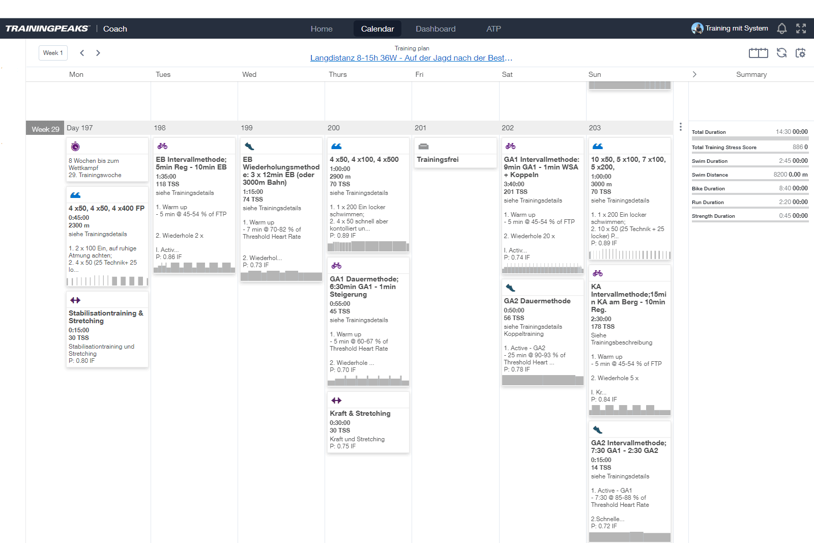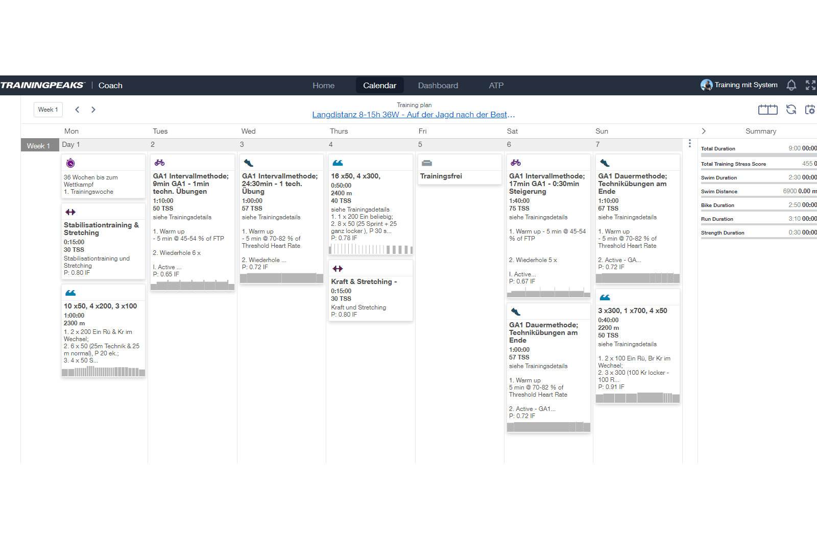 TrainingPeaks ist ein kostenlos nutzbare Plattform / Kalender zum Aufzeichnen, Verfolgen und Analysieren der Trainingseinheiten. - Eine effektive automatische Synchronisation der Trainingsdaten ist möglich, jede Trainingseinheit wird dadurch bis ins kleinste Detail erfasst und dargestellt.