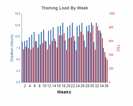Es gibt in der Endphase, der 32. Trainingswoche ein Wochenende mit erhöhtem Trainingsvolumen, mit Fokus auf lange gekoppelte Einheiten zur spezifischen Belastungsvorbereitung.