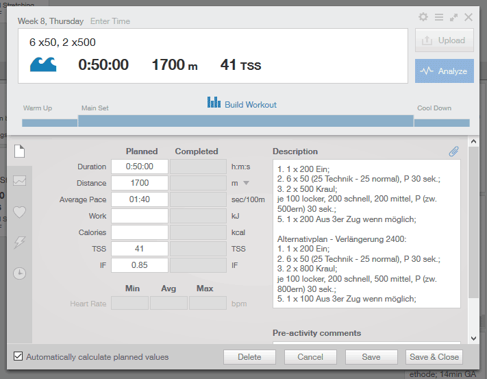 - Jede Einheit für Schwimmen, Radfahren und Laufen enthält detaillierte Trainingsvorgaben über die Intensität und Dauer der Intervalle bzw. der Trainingseinheit.